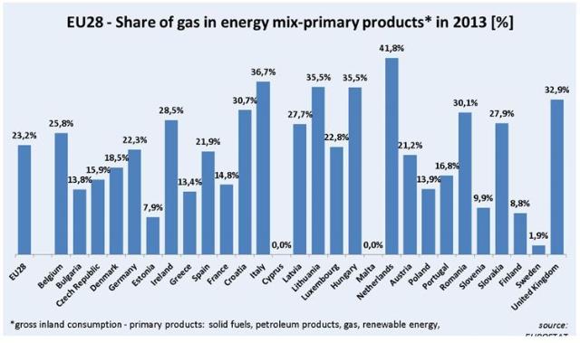 Die am wenigsten von Gasimporten abhängigen Mitgliedstaaten waren nach vorläufigen Eurostat-Daten im Jahr 2014 Rumänien (5 %) und Kroatien (28,6 %). Dänemark und die Niederlande waren Netto-Gasexporteure, wogegen Malta und Zypern angaben, überhaupt kein Erdgas zu verbrauchen. Alle anderen Mitgliedstaaten sind mit Anteilen von über 70 % ihres Bruttoinlandsverbrauchs von Gasimporten abhängig.